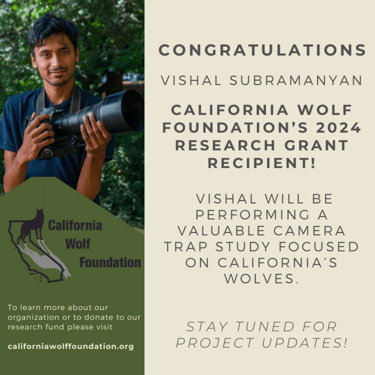 Our 2024 Research Grant recipient was Vishal Subramanyan. Vishal is an award-winning wildlife photographer and now recent graduate from the University of California, Berkeley known for his stunning images of California nature—from elusive bobcats to rare badgers. Using camera traps, telephoto lenses, and other photography techniques, he captures unique imagery that raises awareness about conservation and inspires action. With an academic background in ecology, Subramanyan integrates science into his storytelling efforts to create deeply compelling stories. Vishal has been taking part in a collaborative new effort to capture some of the first ever high-quality photos of California’s newly established wolf packs. This camera trap work will support research aimed at learning more about wolves in California and their role on the landscape.